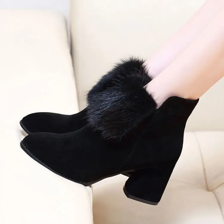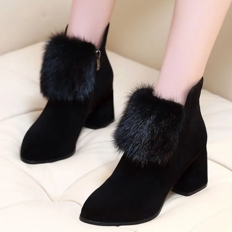 Upper Fixing Method:Sticking Upper coverage:Above the ankle but not to the knee Gender:Women Style:Concise Material:Flannel,Rubber,Short Plush Color:Black Size:35-40 Pattern Type:Solid Season:Autumn,Winter Heel Type:Square Heel Toe Shape:Pointed Toe Boot Type:Modern Boots Boot Height:Ankle Item Type..